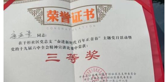 黄兴厂党支部青年党员获干杉社区演讲比赛三等奖 (通讯员?符弘珉)11月28日上午,黄兴厂党支部青年党员聂涛、预备党员唐亚星作为代表,参加了所在干杉社区党总支开展的“奋进新时代·百年正青春”演讲比赛,并取得了三等奖和优胜奖的好成绩。 本次演讲比赛旨在贯彻党的十九届六中全会精神,巩固党史学习教育成果,回...